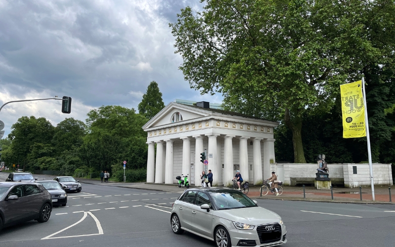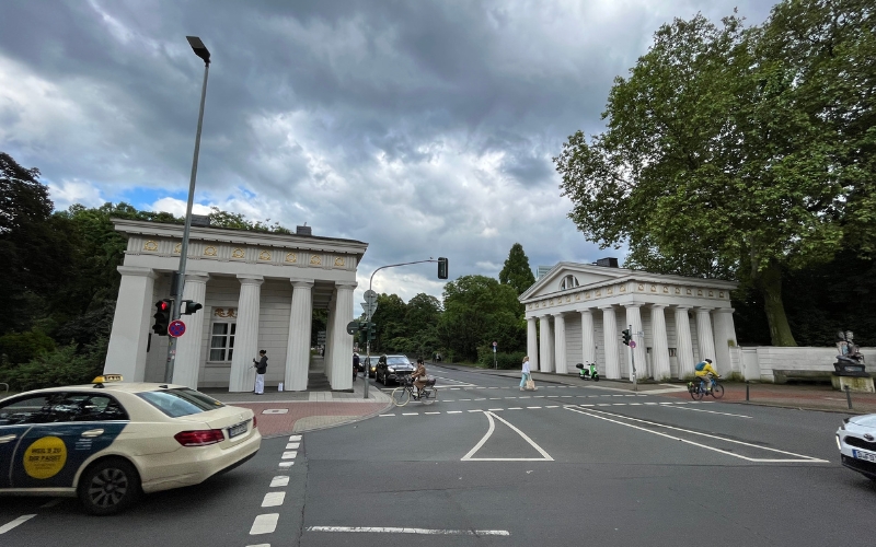 Das Ratinger Tor ist das letzte erhaltene Stadttor der ursprünglichen Stadt Düsseldorf, das zwischen 1811 und 1815 im klassizistischen Stil als Zolltor neu errichtet wurde. Es ersetzte das mittelalterliche Tor, das im Rahmen der Festungsschleifung abgerissen wurde. Das neue Tor wurde etwa 115 Meter östlich vom alten Standort errichtet, was die Verlängerung der Ratinger Straße ermöglichte und den Bau der Heinrich-Heine-Allee zur Folge hatte. Architektonisch besteht das Ratinger Tor aus zwei quadratischen Gebäuden mit dorischen Säulen, die an antike Tempel erinnern. Es wurde von Adolph von Vagedes entworfen und gilt als ein Hauptwerk seiner Zeit. Die Geschichte des Tors reicht bis ins 14. Jahrhundert zurück, als ein erstes Stadttor in dieser Gegend erwähnt wurde. Das alte Ratinger Tor wurde im 18. Jahrhundert umgestaltet, bevor es schließlich für den Bau des neuen Tors abgerissen wurde. Das Ratinger Tor verlor im Laufe des 19. Jahrhunderts seine ursprüngliche Funktion als Zolltor und diente später verschiedenen Zwecken, bevor es seine heutige Nutzung als kultureller Raum fand. Das nördliche Torhaus wird vom Heimatverein Düsseldorfer Jonges genutzt und ist einmal im Jahr öffentlich zugänglich. Das südliche Tor beherbergte unter anderem das Atelier des Künstlers Markus Lüpertz und wurde 2022 um eine Bronzeplastik von ihm bereichert, die an das Musikerpaar Clara und Robert Schumann erinnert.